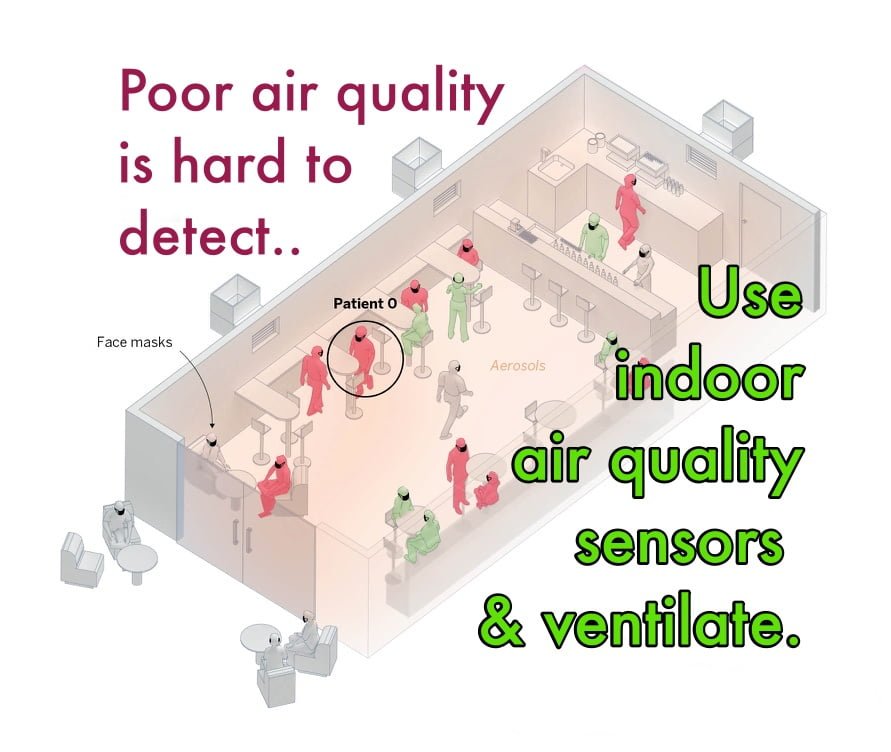 Some modern buildings have heating, ventilation, and air conditioning (HVAC) systems that can be adjusted to allow a mix of outside air at a certain ratio to balance the cooling and ventilation of the building. These must be configured by the building administrators. While we can feel if a building is cool, we don’t really know if a building is well ventilated. Only building administrators know that but they won’t necessarily broadcast that. It’s up to us to know.